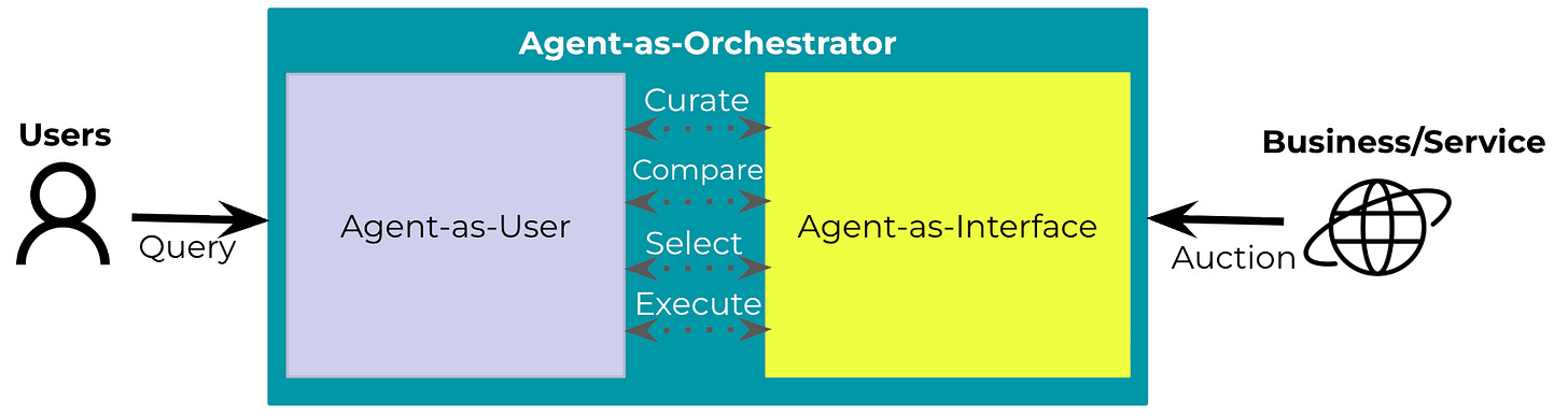 Agent-as-Orchestrator converges to create tomorrow's "web interface"—sophisticated coordination systems that orchestrate multiple AI agents across distributed services to accomplish complex, multi-step tasks. These AI orchestrators will mediate interactions between agent users and agent interfaces, intelligently filtering and contextualizing information exchange. Consider a scenario where an agent user requires specific data: the orchestrator ensures that agent interfaces expose only the relevant, necessary information while maintaining privacy and efficiency. The orchestrator functions as both interface and user from each perspective, seamlessly taking requests, processing context, distributing subtasks, and executing coordinated actions across the agent network. For human users, this creates hyper-personalized visual experiences where agent orchestrators fetch structured data and dynamically render customized interfaces through standardized protocols, transforming raw information into contextually optimized presentations tailored to individual needs and preferences.