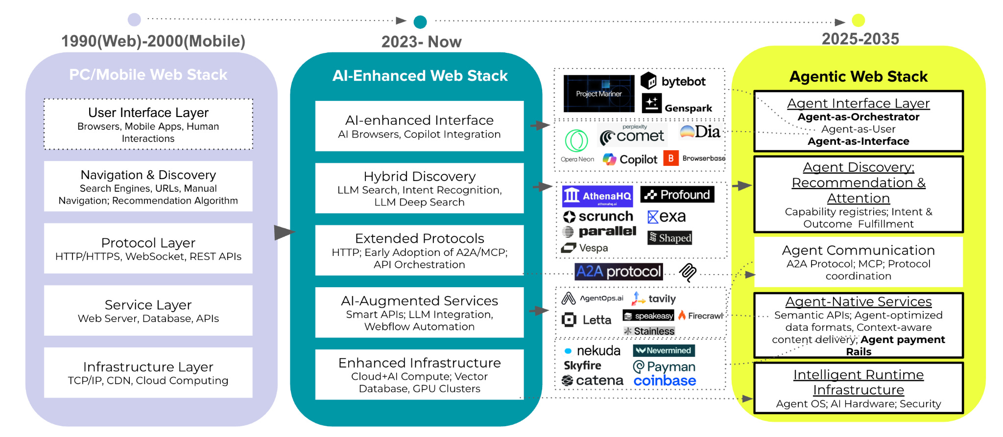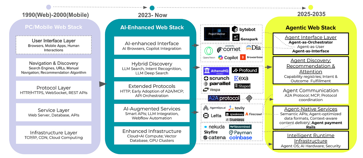 Today's web stack optimizes for human interaction at every layer. Browsers render visual interfaces for human eyes and attention, search engines return lists for human interpretation, and protocols like HTTP facilitate request-response patterns between humans and servers. This architecture has served us well for three decades, but it creates inherent friction and gaps when AI agents attempt to navigate systems designed for human cognition. We're currently in the transitional phase, where AI capabilities augment but don't replace human-centric design. AI-enhanced interfaces like Copilot integration provide intelligent assistance, while hybrid discovery systems combine traditional search with LLM-powered intent recognition. Extended protocols begin supporting early A2A and MCP interactions, and AI-augmented services offer smart APIs alongside traditional interfaces.